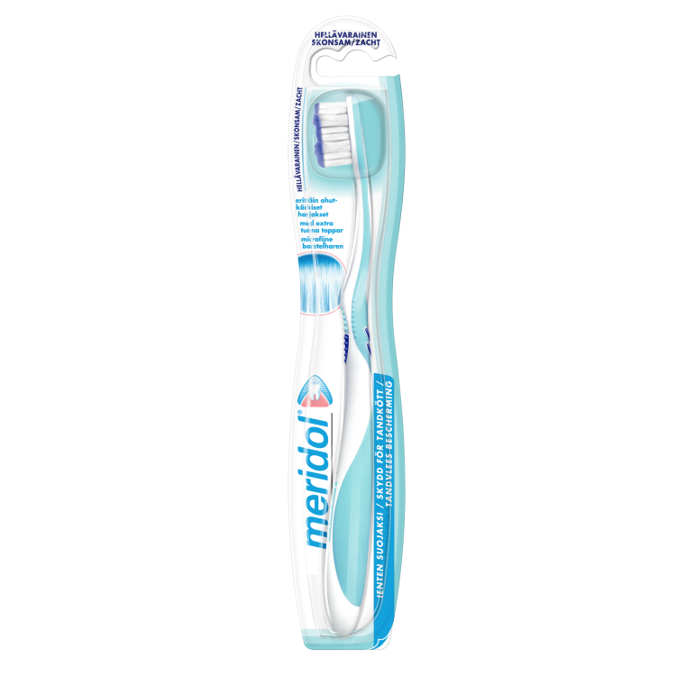 Erityisen pehmeän meridol®-hammasharjan ohutkärkiset harjakset puhdistavat hampaat pakista hellävaraisesti. Suunniteltu erityisesti ärtyneille ikenille.