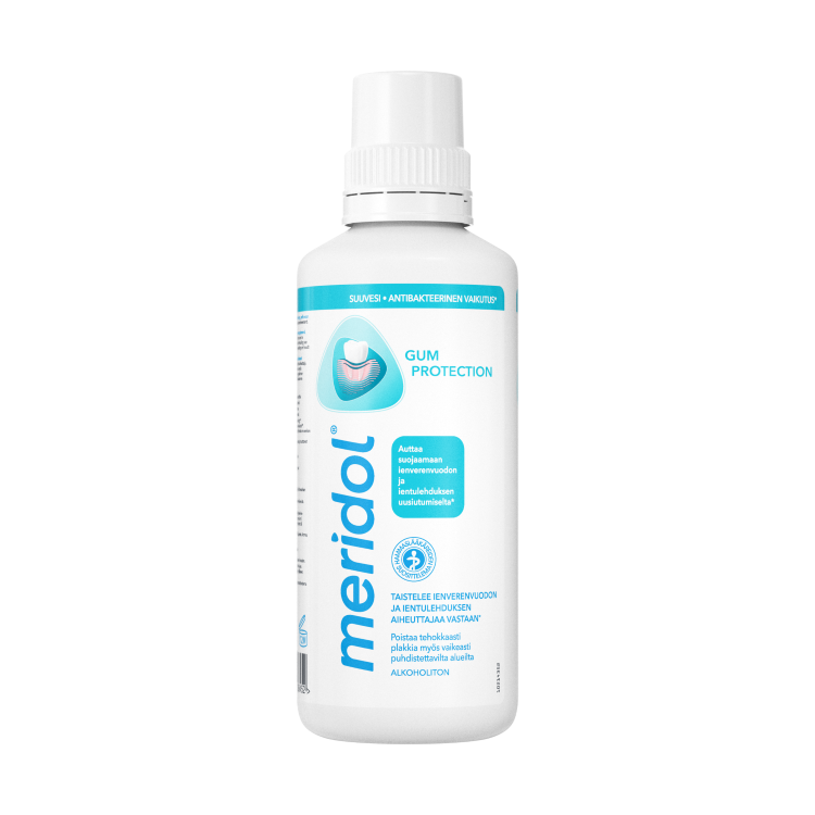meridol® Gum Protection -suuveden kaksoisaktiivinen koostumus taistelee ienverenvuodon aiheuttajaa sekä ientulehdusta* vastaan, ja auttaa estämään vaivan uusiutumisen*